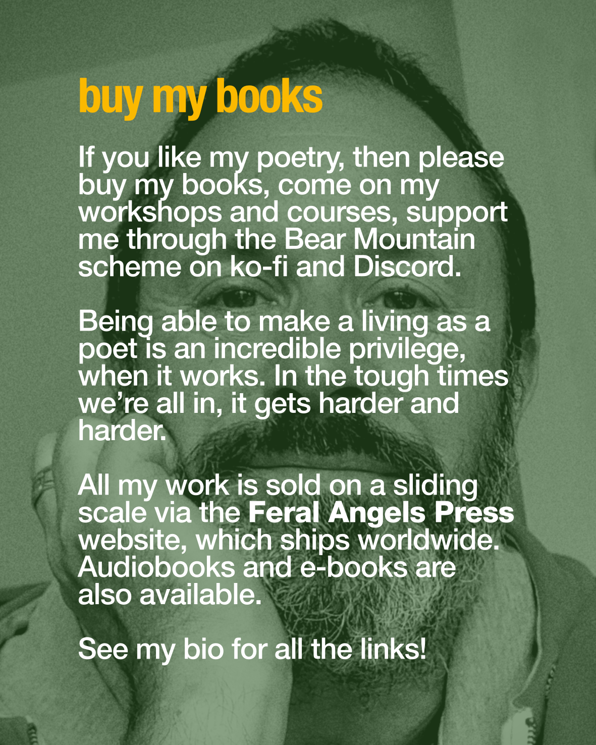 In between balancing the various challenges of being a human living in 2026, trying to be a half-decent father, tending alive and genuine relationships with other humans, and running a small press and poetry magazine, I try to find time to write. Often it's in the early hours of the morning, or reco...Read more